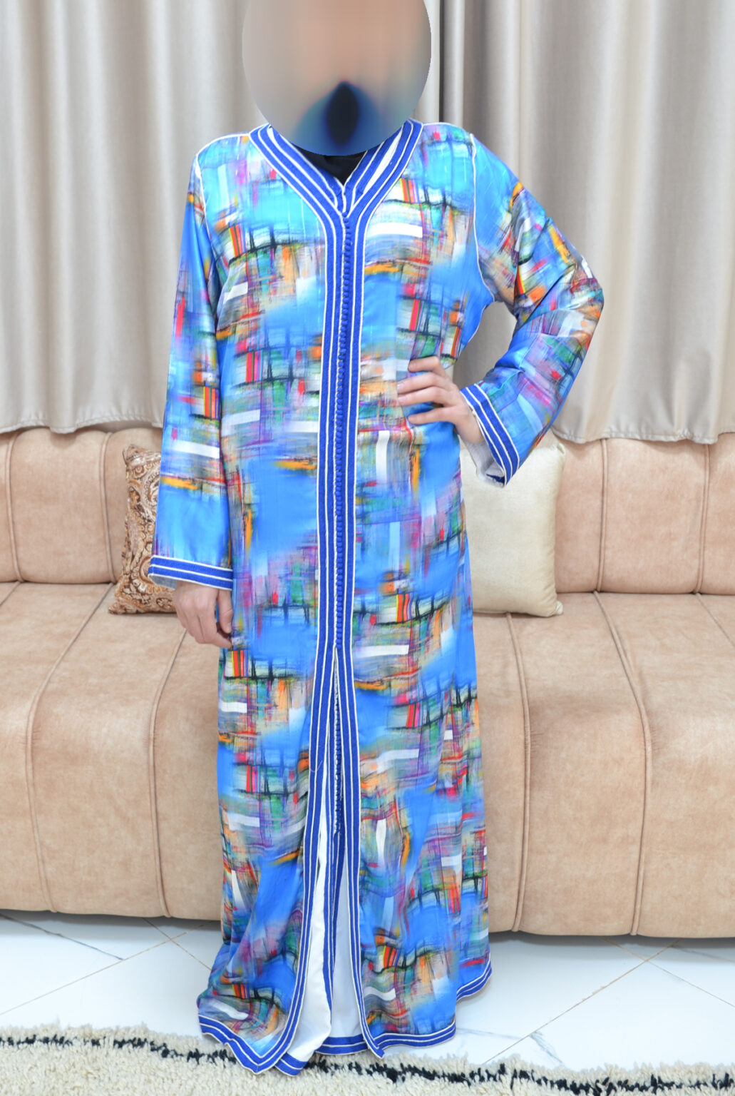 Un caftan bleu royal avec des motifs marocains typiques. Un mélange parfait entre tradition et élégance, pour briller lors des grandes occasions.